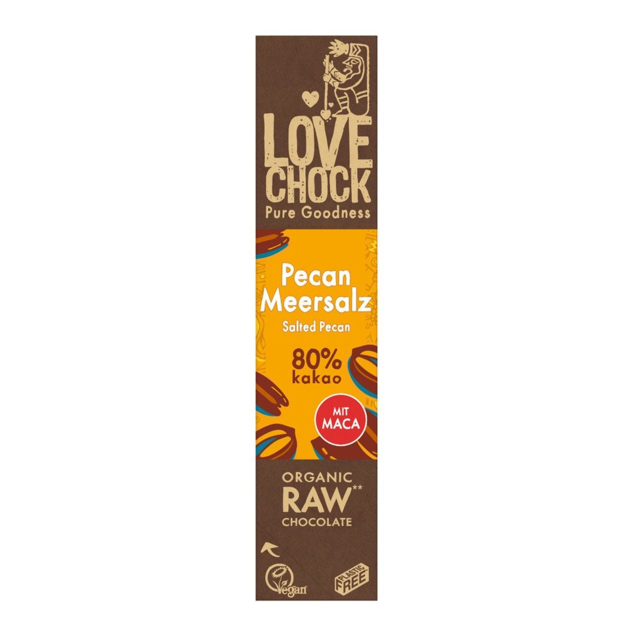 Ingrédients: Pâte de cacao crue*, beurre de cacao*, NOIX DE PÉCAN* 15%, dattes*, nectar de fleur de coco*, poudre de maca* 2.6%, sel de mer 0.5%, vanille en poudre*, huile de fenouil*. Cacao: 80% minimum dans le chocolat.