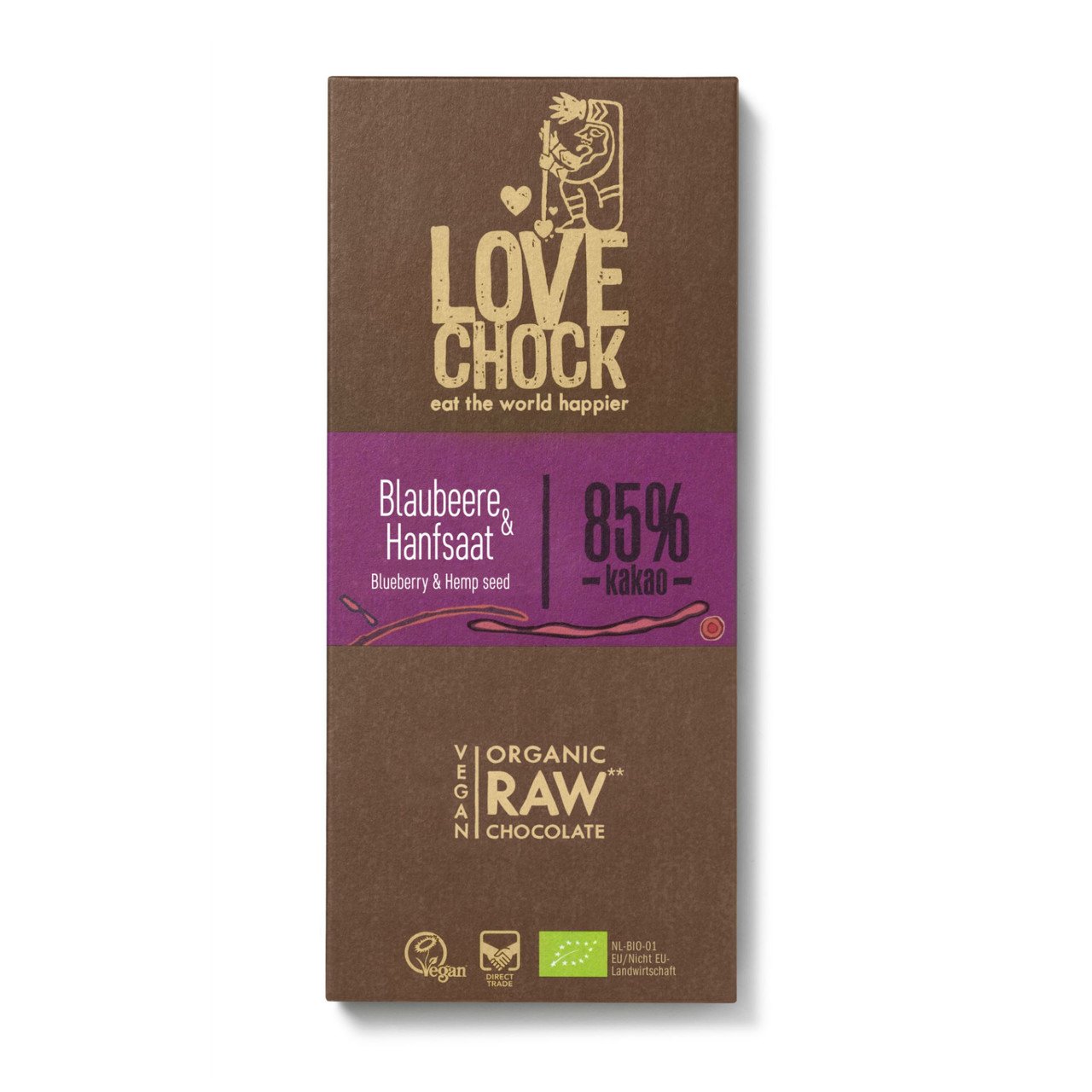 Ingrédients: Pâte de cacao crue*, beurre de cacao*, sucre de coco*, graines de chanvre* 9%, dattes*, myrtilles lyophilisées* 4%, vanille en poudre*, sel de mer. Cacao: au moins 85% dans le chocolat. Légende: * Biologique, ** Bourgeon, *** Demeter