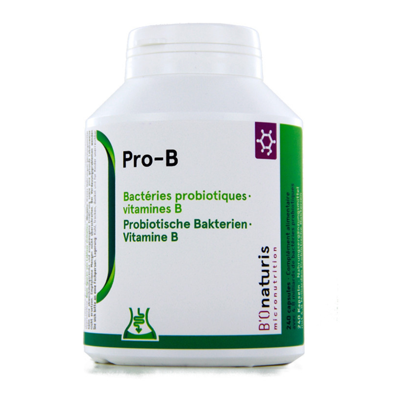 Probiotiques 4.8 Milliards (Lactococcus lactis 960 millions, Lactobacillus helveticus 960 millions, Strepto-coccus thermophilus 960 millions, Lactobacillus rhamnosus 960 millions, Bifidobacterium longum 960 millions); fructo-oligosaccharides 60 mg; nicotinamide (vitamine B3) 8 mg; D-pantothénate de calcium (vitamine B5) 3 mg; riboflavine (vitamine B2) 0.7 mg; hydrochlorure de pyridoxine (vitamine B6) 0.7 mg; hydrochlorure de thiamine (vitamine B1) 0.55 mg; acide folique (vitamine B9) 0.1 mg; D-biotine (vitamine B8) 0.02 mg; cyanocobalamine (vitamine B12) 1.25 µg; anti-agglomérant: stéarate de magnésium 5mg; gélule végétale: hydroxypropylmé-thylcellulose 95mg.